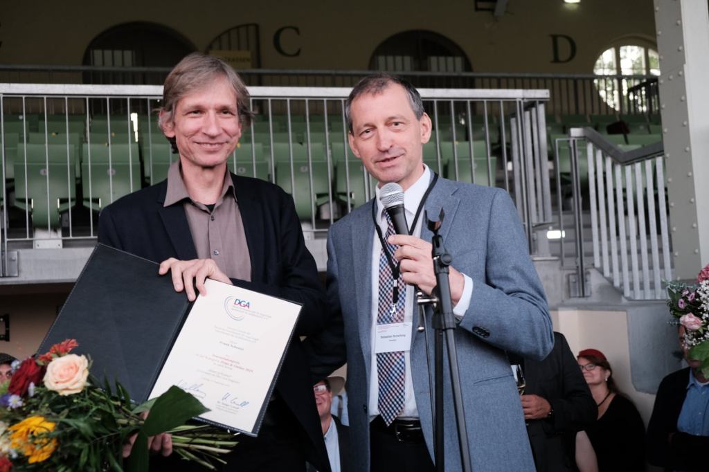 (September 2019) „Sitzen ist Krampf“ lautete der Titel meines Artikels im ÖKO-TEST Magazin für den ich den Journalistenpreis der DGA (Deutsche Gesellschaft für Angiologie) in Leipzig – natürlich stehend – in Empfang nehmen durfte. Rechts neben mir DGA-Präsident Prof. Dr. Sebastian Schellong.